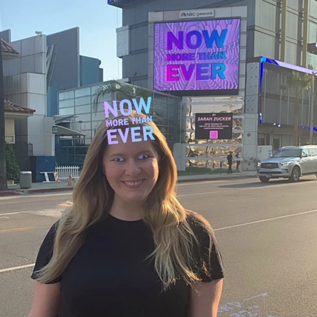 Using the “Now More Than Ever” face filter in front of the billboard at 8410 Sunset Blvd.