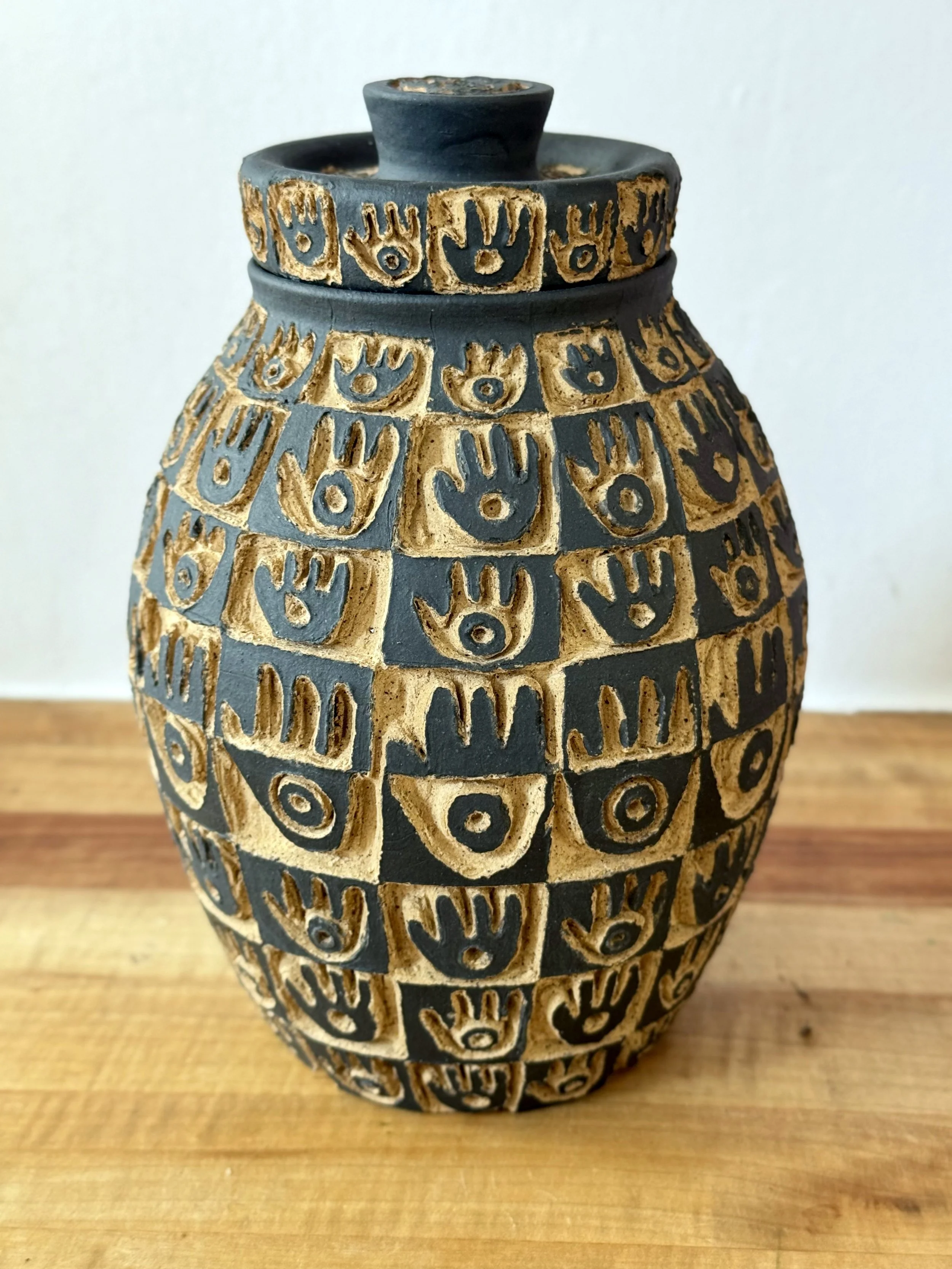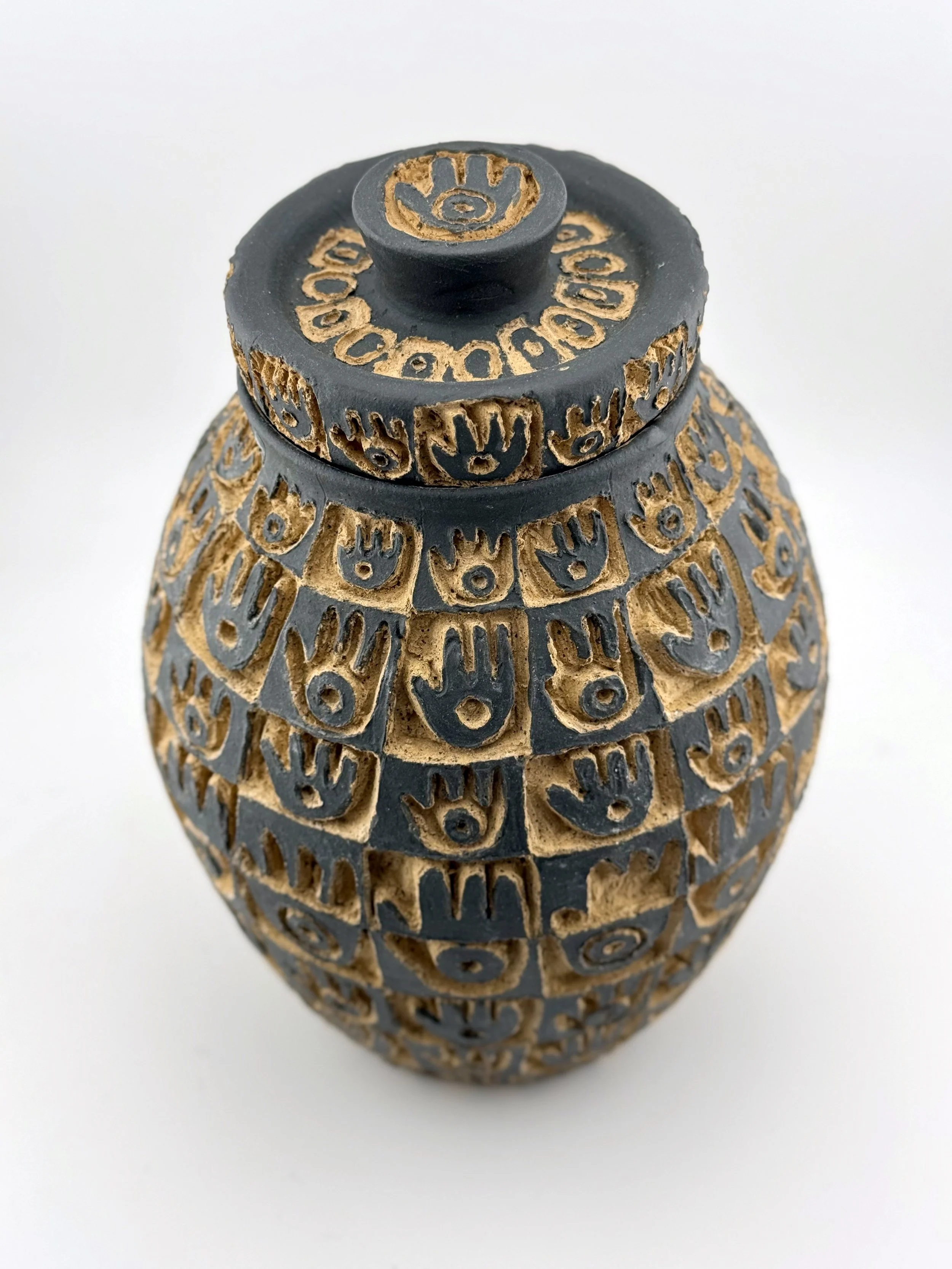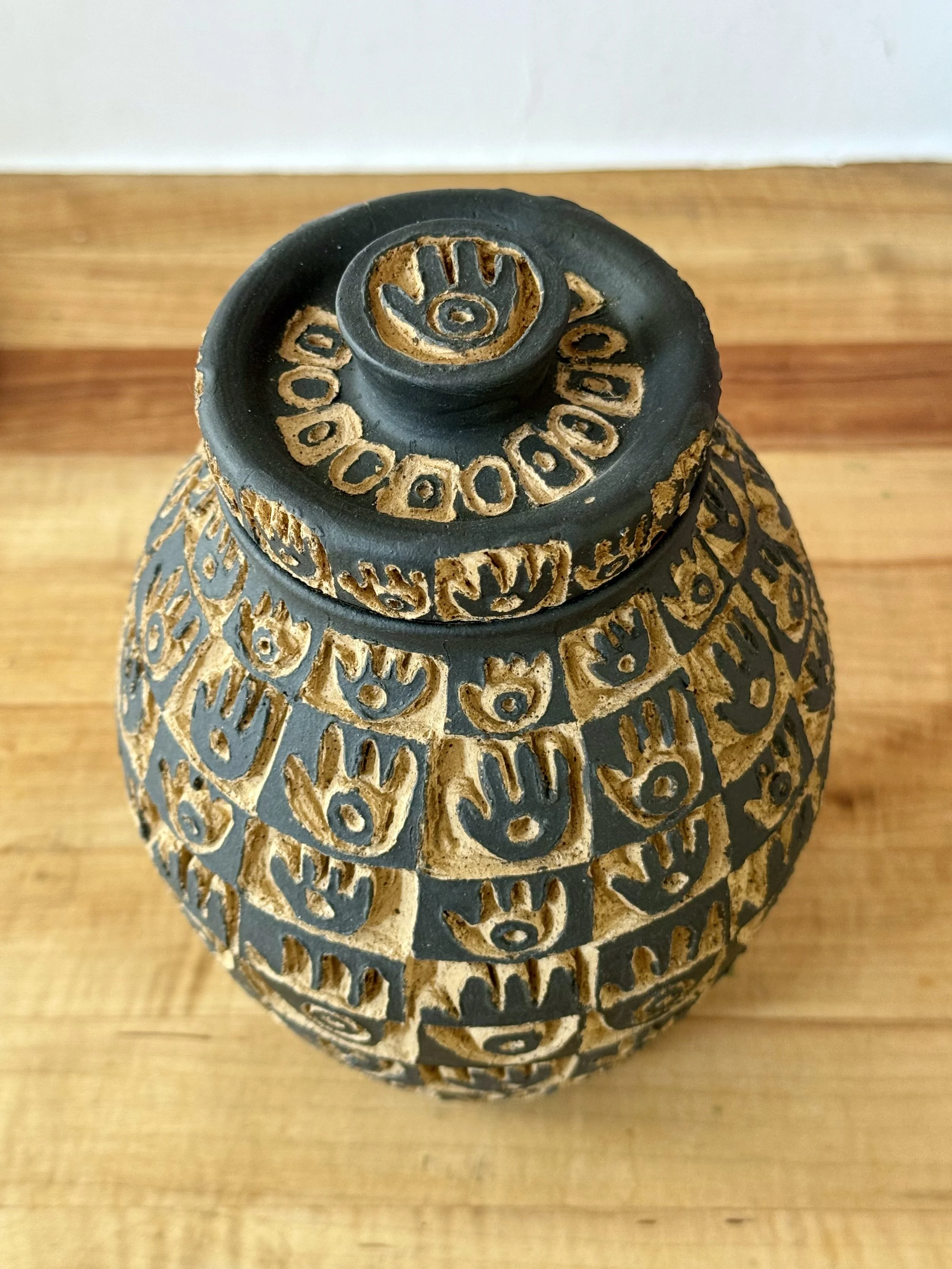 Lidded Vessels Categories: All Bowls Candlesticks Desert Judaica Lidded Vessels Pitchers Platters Vases All / Hamsa Jar